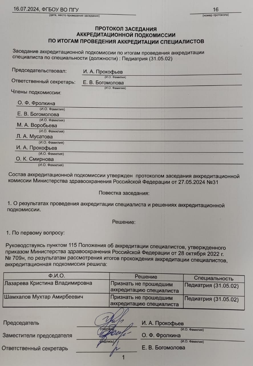 Протокол заседания аккредитационной подкомиссии по итогам проведения аккредитации специалистов